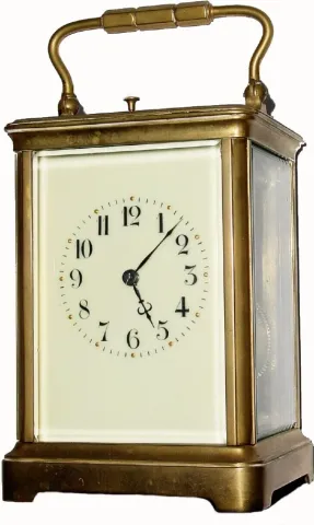 C.1900, French, Brass Cased Carriage clock, Petite Sonnerie/repeat, in a Corniche case, as-found, original condition. The original lever platform is intact, but the movement is dirty and the strike is hung up (please don't wind it any tighter prior to service). Everything is complete and sound and the original creamy porcelain dial is perfect, as is the beveled glass. Lots of potential here. Height 7"