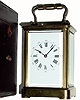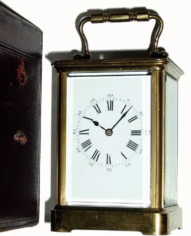 Mixed lot: C.1900, Brass Carriage Clock, striking movement, now in another case of the same period, but with a second set of mounting holes in the base of the case. Note the lever-platform is original to the No.8577-well made movement, and staff is good, but balance is over-banked, thus movement not running. Case is sound and glass is good. The dial is original to the movement and fits the case perfectly, just not original, also with a lined leather covered carry case that is a bit too large for the clock. Use for parts or enjoy as is. Height 53/4"