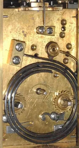 striking movement, now in another case of the same period, but with a second set of mounting holes in the base of the case. Note the lever-platform is original to the No.8577-well made movement, and staff is good, but balance is over-banked, thus movement not running. Case is sound and glass is good. The dial is original to the movement and fits the case perfectly, just not original, also with a lined leather covered carry case that is a bit too large for the clock. Use for parts or enjoy as is. Height 53/4"
