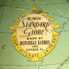Note the globe is NOT driven by the standard 30 hour tape movement in the base. However, the company added a subsidiary dial around the stand which lists all major cities on each continent, and makes it easy enough to calculate the time at any location. The globe itself is by Replogle Globe Co of Chicago, paper over pressed cardboard and is in good condition (minor wear in Arctic region). These were only a few dollars when new, but very few have survived. Two standard nuts are missing from the dust cover on the base. Height 15"