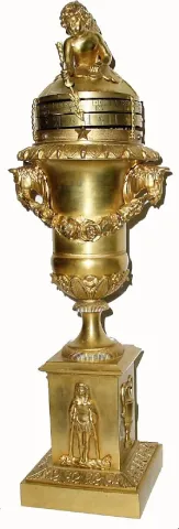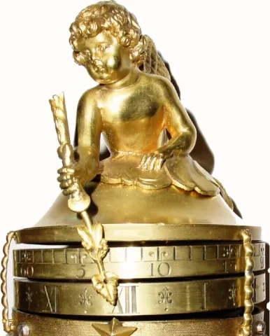 Mixed lot: C.1850, a good Napoleon III Annular dial case, dials and top, into which has been fitted at C.1900 French time only movement, with a half dozen extra holes that reveal the work. The case is done in an Egyptian motif and is quite attractive. Putti on top piece hold arrow that points to the time. If this had been original, we would have expected it to bring around $8000, so our estimate reflects the associated movement. It does run; note lower reserve than last auction. Height 18"