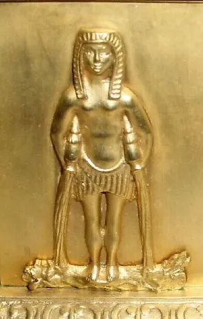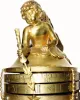 with a half dozen extra holes that reveal the work. The case is done in an Egyptian motif and is quite attractive. Putti on top piece hold arrow that points to the time. If this had been original, we would have expected it to bring around $8000, so our estimate reflects the associated movement. It does run; note lower reserve than last auction. Height 18"