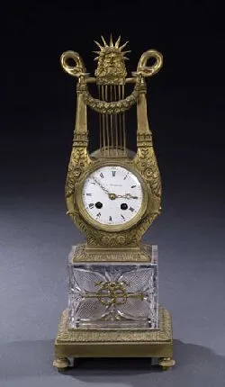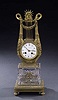 The circular white enamel clock face with black Roman numerals and maker's mark (illegible) set in a lyre-form case cast with acanthus, anthemeon and rosettes and surmounted by a male mask issuing sun rays flanked by swans holding a floral garland, the rectangular glass base molded with cross-hatched quatrefoils on a leaftip and rosette cast base and four disk feet - 19 5/8 in. (50 cm) high.Sale 932 Lot 270 (IMPORTANT:The "price realized" includes a buyer's premium of 17.5%)
