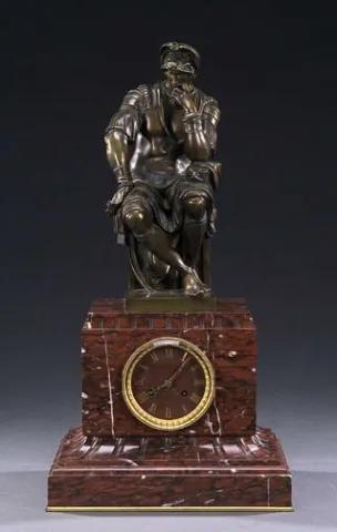 A FRENCH PATINATED BRONZE AND ROUGE MARBLE FIGURAL MANTEL CLOCK, late 19th century, movement stamped Barrard & Vignon, Paris, bronze stamped 'Cie Anonyme des Bronzes/Bruxelles'. The figure depicting Duke Lorenzo after Michelangelo - 24 in. (61 cm) high. Sale 942 Lot 934 (IMPORTANT:The "price realized" includes a buyer's premium of 17.5%)