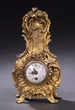 A LOUIS XV STYLE GILT METAL TABLE CLOCK, circa 1913, inscribed 'Dormain and Hattie/ November 17, 1863 Lowell/ and/ November 17, 1913 New York'. The enamel clock face painted with Arabic numerals and floral garlands fitted in a cartouche-form case with rocaille and floral decoration, monogrammed WC - 8 1/2 in. (21.5 cm). Sale 938 Lot 245 (IMPORTANT:The "price realized" includes a buyer's premium of 17.5%)