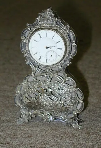 A DUTCH SILVER MINIATURE BRACKET CLOCK, late 19th century. The circular enamel clock face within a waisted case pierced with putti in relief on a diaper cartouche, the sides with trailing rocailles, on foliate feet. 6 1/2 in. high (16.5 cm) Sale 935 Lot 111 (IMPORTANT:The "price realized" includes a buyer's premium of 17.5%)