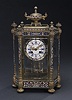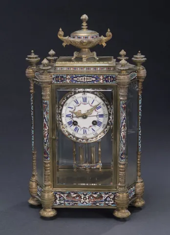 The circular enamel clock face with Roman chapters within a shaped beveled glass case with champleve pilasters, surmounted by an urn, on toupie feet - 15 1/4 in. (38.8 cm) high. Sale 929 Lot 355 (IMPORTANT:The "price realized" includes a buyer's premium of 17.5%)