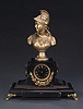 VICTORIAN GILT METAL AND SLATE MANTEL CLOCK, late 19th century. Surmounted by a bust of Minerva the shaped case with a circular dial over a pair of branches, mounted with anthemeon border, tiger head handles and paw feet, with key - 23 1/2 in. (59.6 cm) high; 18 in. (45.7 cm) wide. Sale 922 Lot 521 (IMPORTANT:The "price realized" includes a buyer's premium of 17.5%)