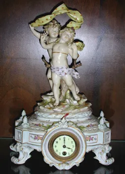 In the Meissen style, the circular clock face with Arabic chapters within a rounded-rectangular case painted with flowers and surmounted by two scantily draped children holding wind-blown drapery, the whole raised on scroll feet enriched in pale-pink, turquoise and gilt - 13 in. (33 cm.) high. (IMPORTANT:The "price realized" includes a buyer's premium of 17.5%)