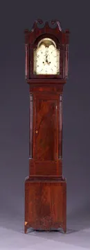 The painted dial with Arabic numerals, subsidiary seconds dial, date aperture and leaf-painted spandrels, the arch with a landscape, a seascape and phases of the moon, the hood with an arched door surmounted by a swan-neck pediment on ring-turned colonnettes, the trunk with a rectangular door flanked by free-standing columnar stiles, the plinth on bracket feet joined by a shaped skirt, the door and plinth with cross-banding - 96 1/2 in (245 cm) high. Sale 916 Lot 279. DC Gallery (IMPORTANT:The "price realized" includes a buyer's premium of 17.5%)