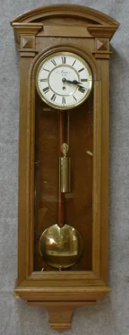 VIENNA POST OFFICE REGULATOR. THIS IS AN 8 DAY SINGLE WEIGHT TIMEPIECE. CIRCA 1900. OAK CASE WITH WHITE PORCELAIN ROMAN DIAL, BRASS WEIGHT AND PENDULUM BOB.H 41" X W 13" X D 6"