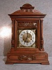 THERE ARE FLUTED COLUMNS ON THE DOOR SIDES, AND CARVED GRAPES ABOVE THE DIAL. THE DIAL IS SQUARE BRASS WITH A SILVERED CHAPTER RING WITH ARABIC NUMERALS AND GILT CORNER SPANDRELS. THE 8-DAY SPRING WOUND MOVEMENT PLAYS THE WESTMINSTER CHIMES ON RODS ON THE 1/4 HOURS AND STRIKES THE HOURS. H.- 18 1/2"x W.- 12 1/2"x D.-8 3/4" Additional keywords: mantel, mantle, shelf