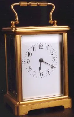 having beveled glass sides all around, with oval glass top revealing open escapement. Presently running, with key. Height 5 1/2 inches with handle raised, width 3 1/4 inches, depth 2 5/8 inches