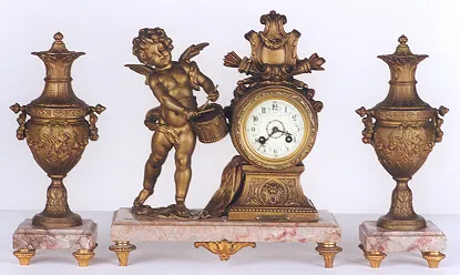 A FRENCH THREE PIECE GILT BRONZE CLOCK SET: the clock with time and bell strike movement, porcelain decorated dial inset on pedestal base with lion's head, having twin quivers of arrows behind shield crest, over colorful roses, balanced by winged cherub playing drum and standing on draped cloth, the bronze after Moreau. On rectangular rouge marble footed.