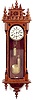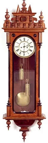 TWO-WEIGHT LONG CASE WALL CLOCK, German, 19th century; the walnut case having ebonized trim, long glazed door, architectural pediment, a full set of turned finials and houses an 8-day time & strike movement powered by visible twin brass weights. Overall case length 4'3".