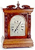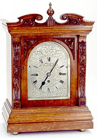 CARVED OAK BRACKET CLOCK, English, c.1900; the carved oak architectural case housing a 3-train, triple fusee, springwound chiming movement behind an engraved and silvered metal dial with Roman numeral chapter ring and lettered "J. W. Benson Ltd. / London. "Dimensions: 21"H x 14"W x 9-3/4"D. Complete with pendulum, wind key and rear door key.