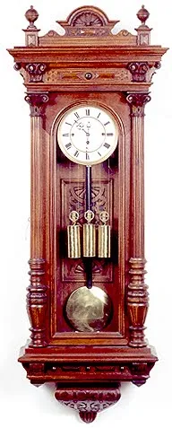 THREE-WEIGHT GRANDE SONNERIE WALL CLOCK, German, 19th century; the carved walnut architectural wall case having a long glass-panel door flanked by turned and reeded columns, the carved and molded cornice surmounted with carved pediment, the 8-day movement powered by three visible brass weights and strikes each quarter hour. Overall case length-50-1/4 inches.