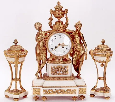 A FRENCH DIRECTOIRE THREE PIECE FIGURAL CLOCK SET:
