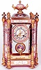the hexagonal case with beveled glass and hand painted porcelain between champleve' enameled ormolu columns, the round porcelain dial decorated with painted cherubs behind gold filigree hands within a border of rhinestones, the exposed pendulum in a similar motif, the. . .