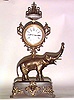 heavy cast elephant with raised trunk, on black base with ormolu mounts, supporting round cased clock having 8 day wind/strike movement. Height 17 1/2 inches