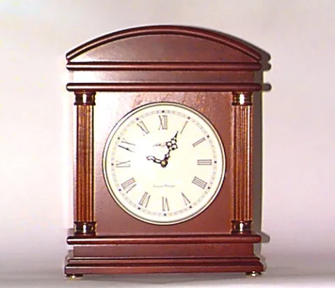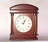 in arched mahogany case, having white face and column accent, height 12 inches...