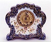 AN ENGLISH VICTORIAN CHINA CASED SHELF CLOCK, cobalt blue with gold accents plus enameled floral design decorate the case. Time and strike movement. Height 11 1/2 inches, width 12 inches