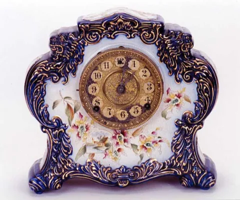 cobalt blue with gold accents plus enameled floral design decorate the case. Time and strike movement. Height 11 1/2 inches, width 12 inches