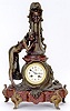 The spelter figure of a young woman drinking from a devil's mask-head fountain, dominates the center clock having time and bell strike movement. The brass rimmed porcelain dial enameled with cherub. Red rouge marble base and accents, with ormolu feet. Height 22 inches, c.1895.