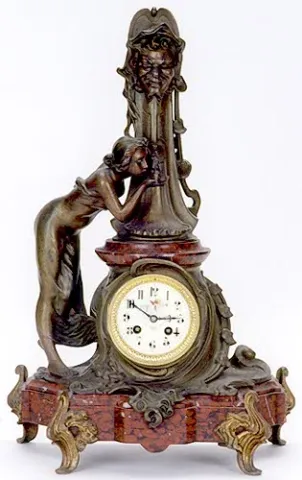 A FRENCH FIGURAL ART NOUVEAU MANTEL CLOCK. The spelter figure of a young woman drinking from a devil's mask-head fountain, dominates the center clock having time and bell strike movement. The brass rimmed porcelain dial enameled with cherub. Red rouge marble base and accents, with ormolu feet. Height 22 inches, c.1895.