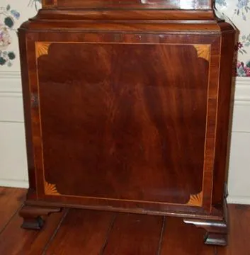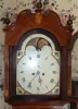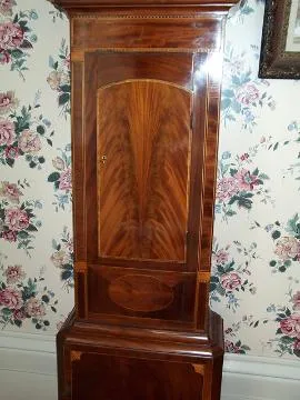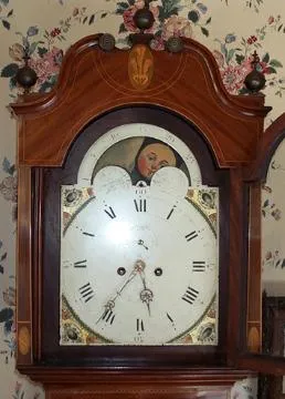 John Barnish was born about 1760, probably the son of William Barnish of Rochdale, Lancaster. Numerous longcase clocks are known by him, including a two-tune musical dated 1785. He is documented in Brian Loomes book: "Clock Makers of Northern England." An exceptional mahogany tallcase in the Hepplewhite design. Note the flat pillars with inlay to the hood. Prince of Wales feathers are inlaid in the broken arch of hood. There is stringing, fan and shell inlay through out the grand case. The dial is original paint, signed by the maker and has a moon roller, indicating the phases of the moon. Also a seconds subsidiary dial and engraved brass hands. Corners spandrels have a shell design. This is an eight day tallcase, the brass movement having four pillars, anchor escapement and running in fine order. Height: 95 inches (242cm)-to top of finial Width: 16.5 inches (42cm)-at the trunk 22 inches (56cm)-at the foot Depth: 9.5 inches (24cm)-depth of hood.