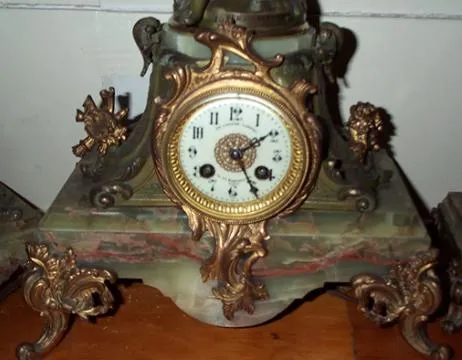 French three piece green onyx garniture having two side candelabrums with five holders. An elaborate clock with lady statue-signed on front plaque: "FEE aux FLEURS" par L. Moreau The porcelain dial is signed: "Aug. Cadran-24 Fg- Montmartre, Paris" The movement is signed: "Vincenti-Medaille Bronze-1855" A grand clock set in excellent condition. Duration eight days Height 26 inches (66cm) Width: 13 inches (33cm) Depth- at foot-7.5 inches ( 19cm )