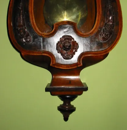 SERPENTINE VIENNA WALL CLOCK, 3/4 SIZE, c.1860-70 PATINA IS ALL ORIGINAL-SIMULATING BURLED WALNUT AND LIGHT WALNUT. AN EXCEPTIONAL CASE WITH CARVED ROSES. THE SERPENTINE STYLE DATES BETWEEN 1860 AND 1870. THE TWO PIECE Porcelain DIAL HAS FINE SLENDER HANDS. A SINGLE BRASS WEIGHT KEEPS IT RUNNING FOR EIGHT DAYS ON A WINDING TWO-TONED CASE WITH CARVING Height 41 inches (104 cm