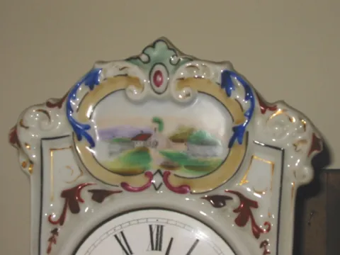 A fine porcelain wall clock made in the Black Forest of Germany. They were produced with many different shapes of sheilds, very often a local scene wa...