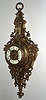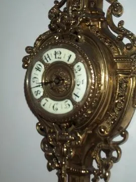 A FRENCH BRASS CARTEL WALL CLOCK SHOWING "GARGOYLES, URNS, AND FLEURS DE LIS". IT IS UNIQUE, HAVING ARABIC NUMERALS IN FOUR PORCELAINE PLAQUES. AN ALL BRASS CASE, EIGHT DAY DURATION Height 29inches (74cm)