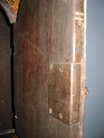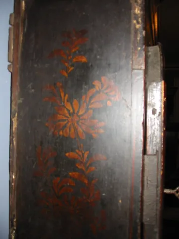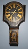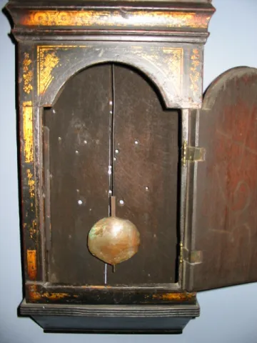 This is an early shield dial tavern clock, also known as an "Act of Parliament Clock." The case is of solid oak and has some restoration done much earlier. The original lacquering has become a shade less detailed in areas. The dial has been repainted. A full minute track should be outside the hour numerals. Hour roman numerals should be-31/8 inches Minute numerals should be- 15/8 inches, all done in gilt to match the japanning of the rest of the case. Fairly good flower decoration remains on each side and the door is quite lovely. Two gilt wooden finials are to surmount both top corners. The original brass movement has rectangular solid plates, four pillars, anchor escapement and a five wheel train. It will wind counter clockwise. Pendulum is old lead and has convex brass covering. The imposing door on the front of clock is 1 inch thick oak. Height: 62 inches (158cm) Width at dial surround: 30 inches (76cm) Depth at trunk: 7 inches (18cm)