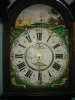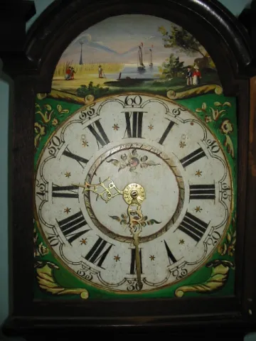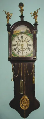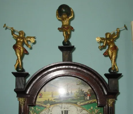 These clocks are sometimes called "Tail clocks or Hood clocks" In the arch of the hood we have a dutch landscape with sailing boats and Dutch genre. The four corners of the dial are painted with flowers and horns of plenty. The case is solid oak and the hood is adorned with Atlas as a central ornament flanked by angel trumpeters. They are made of wood, painted and gilt. The beautiful white dial has a typical dutch chapter ring with roman numerals, and outer 5 minute increments. The alarm dial is centered in the dial also. Heavy brass hands are original and fancy. The clock runs one day, striking the hours and half hour on a bell. The pendulum is enclosed inside the tail of the case and is seen through the decorative brass aperture . This brass ornament displays a basket of flowers, birds and a sun. The weights are encased in brass. In the pictures given it shows a decorative way to hang the chains on the clock if desired. An original key stabalizes the lower part of case , until it needs to be lowered to access the pendulum. Height: 57 inches (145cm) Width: 16 inches (41cm)-across the tail Depth: of hood: 8 (20cm )