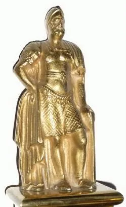 C.1900, English Brass Cased Timepiece, in a polished brass case with an Anglo Saxon warrior on top. This clock has a unique layout with center seconds, and the minutes and hours showing on a small dial below the seconds hand. Has a robust and well made going barrel movement with lever escapement. The engraved and silvered brass dial is in good condition. Note F/S regulation is by a shaft above the seconds hand. There are no marking of any kind on either the case or dial to give us an idea of the manufacturer or the special purpose of the clock. Very eye catching. Runs briskly. Dial diameter 7 inches, Height 16.5 inches