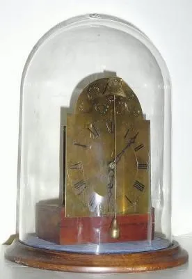 This clock runs a few days, unlike most from this time period that have to be wound every day. Someone has mounted it to a block of walnut, added a new brass dial and hands and covered it with a glass dome. It does make an interesting display. Height of dial 7 inches Overall 13 inches. A European collector should have interest in returning this to a case.