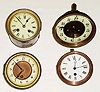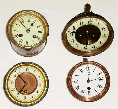 Round plate 8-day French shelf clock movements in unrestored condition with dials and bezels and complete unless noted: (1) Timepiece with original hands. Porcelain dial has crack and chip near 8:00. Bezel glass and one movement holder missing. Diameter of bezel 3ae"; (2) Timepiece with original hands. Good porcelain dial with sunken brass center. No bezel glass and pallet fork broken, but present. Diameter of bezel 4ae; (3) Heavy count wheel striking movement marked "AD. Mougin". Porcelain dial in good condition with sunken brass center. Bezel glass in good condition. Hands not original and shalf for adjusting time through dial missing. Diameter of bezel 5ae"; (4) Double wind pendulum timepiece (15-day?) marked "Japy Freres and Cie" now fitted into brass case that has been altered for a pendulum movement and to hang on wall. Good bezel, glass and porcelain dial. Diameter of bezel 4Ohm". Hands not original. One bid for all 4.