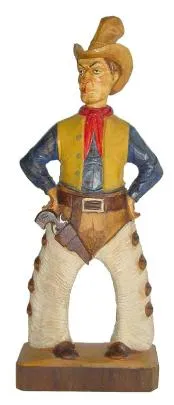 This carving is truly in "Old West" character, with chaps, spurs, red scarf, six shooter and 10 gallon hat. A rare whistler; the last one we had in Ap...