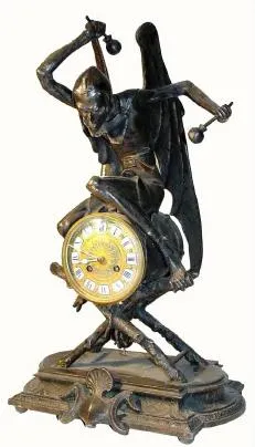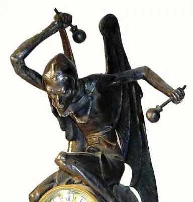 C.1860, French, Bronze Figural Clock, "A Bat Man" with drum sticks. Now when the artist made the original of this statue, we know he had not heard of Bat Man nor Spider Man, and yet the determination he depicts with the slick fitting cap, raised arms and poised wings, look very futuristic for their time. There is no title plaque on this bronze and we have named it in the title line simply because that is what it looks like. The well made striking French movement is complete and sound, and with a brass dial with individual porcelain cartouche numerals. Certain to capture the attention of art aficionados. Height 19 inches