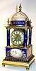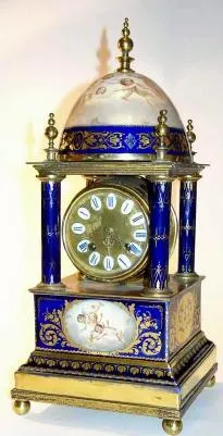 C.1900, Austrian, Fine Porcelain Mantel clock in excellent original condition. The multi-piece porcelain case is in the form of a temple, a base, 4 columns and a dome, all decorated with cobalt blue, gold highlights and hand painted scenes of children floating in the clouds. The well made French striking movement with a brass dial bearing individual cartouche plaques with blue Roman numerals. We've seen these for sale at Camden Passage in London for 3500 Pounds Sterling. Height 16.5 inches