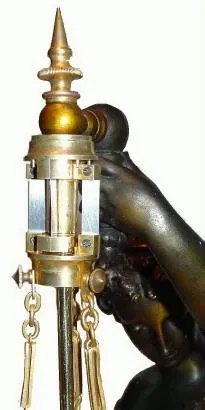 This is a large and impressive clock, standing 28 inches high. The clock movement and ball form the actual pendulum, and are suspended by 3 chains from a 4-point frictionless suspension at top. The suspension unit is held aloft by the raised right hand of Diana. A fixed rod descends from the center of the suspension unit, and the clock/ball rotates around that fixed point. An 8-day clock, very uncommon.