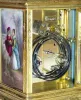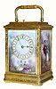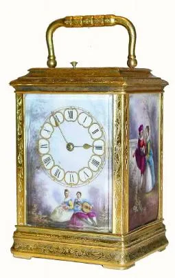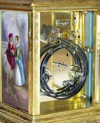 C.1900, French, Brass Cased Carriage Clock, time, strike and repeat, the case with 3 hand painted porcelain panels of a male courting a female in the park. This is a nice case with sharp engraving and bright gilding, and no damage to the panels. The movement has been professionally cleaned and is in good running order. The movement is signed with the letter B in an oval.