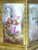 time, strike and repeat, the case with 3 hand painted porcelain panels of a male courting a female in the park. This is a nice case with sharp engraving and bright gilding, and no damage to the panels. The movement has been professionally cleaned and is in good running order. The movement is signed with the letter B in an oval.