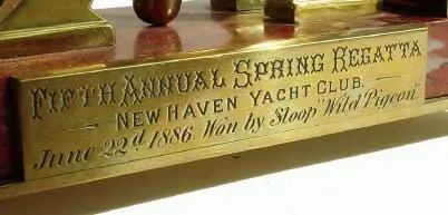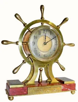 This is a well made 8-day rear wind clock, the brass ship's wheel mounted to a heavy block of red marble with an additional brass base with ball feet. The marble bears an engraved presentation plaque, with the following inscription: Fifth Annual Spring Regatta, New Haven Yacht Club, June 22'd 1886, Won by Sloop "Wild Pigeon". Height 10 inches