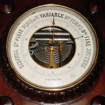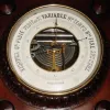 in the nicest carved walnut cases we have seen. These cases have 3 carved figures each, one on either side of the dial (top 1/3 of each column), and the carved male bust above the cornice, each with garlands of grapes wound round their head and flowing out to each side. The time movement is a typical striking French unit; (note hour hand is missing one part of the trefoil), and the barometer is a well made Aneroid. Both pieces selling in this lot 343 for one bid. Height 30 inches