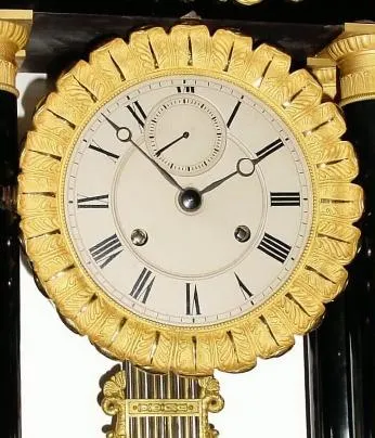This is an ebonized wood case with gilt mountings, and with original bright gilding; note spilling cornucopias both top and bottom. The top of the case has a little loss of the finish above the right pillar. The left front and back pillar have some loss of the finish also (from pendulum hitting pillar in an earlier move with pendulum attached). The well made round French movement has an anchor escapement and bell strike, but most notably is set up with a seconds hand on the silvered dial. The movement has been professionally cleaned and appears to be in running order. Height 21.75 inches