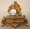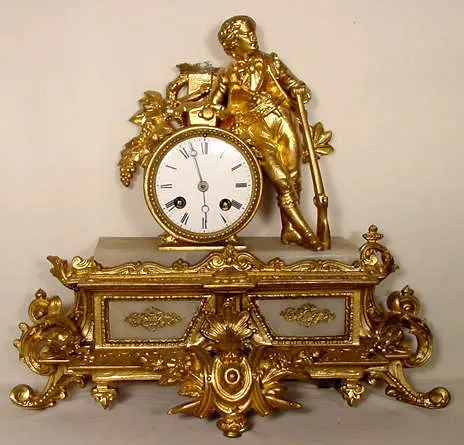 Ormolu and marble table clock with statue of hunter, 13 1/2 inches Tall x 15 inches Wide (loss to top foliage)