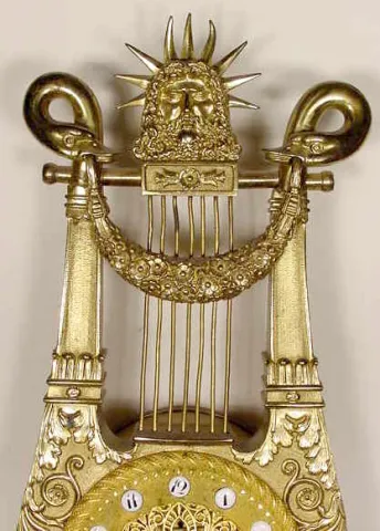 Brass lyre shaped table clock with Greek figures on base, 19 1/2 inches Tall x 7 1/2 inches Wide